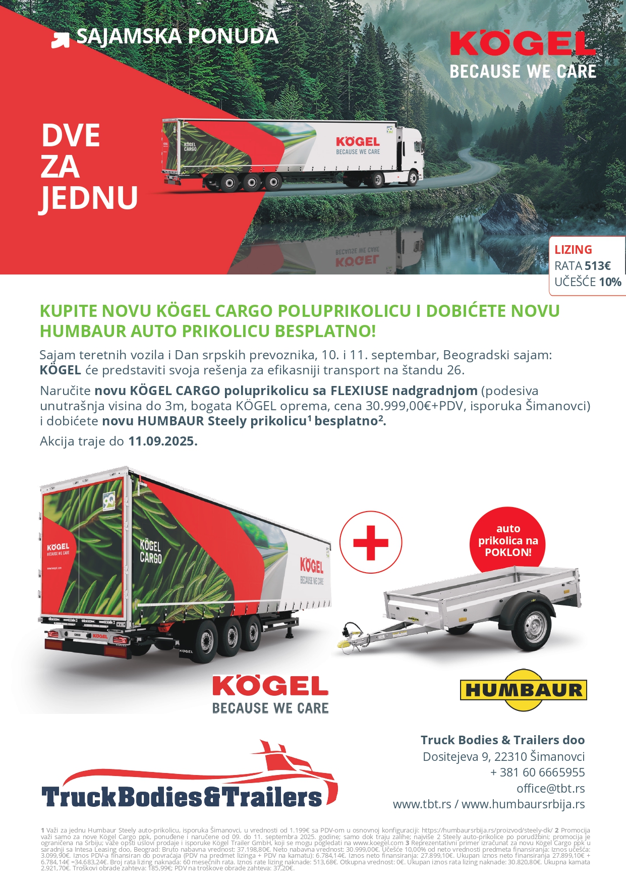 Truck Bodies & Trailers doo je uvoznik za Kögel poluprikolice i Humbaur prikolice na teritoriji Srbije i Crne Gore. Pogledajte njihovu ponudu za posetioce sajma i zainteresovane kupce OVDE.